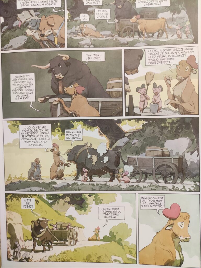 Okładka, z pozoru, nie prezentuje wiele, jednak myślę, że wybór jednego z młodzików na tle pożaru dobrze podsumowuje to, co znajdziemy w środku. Okładki pozostałych tomów znajdują się na końcu tego wydania. Po nich widać, że poziom rysunków Felixa Delepa jest bardzo wysoki. W takich przypadkach zawsze całkiem zapominam, że kwestia dotyczy zwierząt. Jeśli mamy do czynienia z dobrą animacją czy rysunkiem to takie zapomnienie jest bardzo łatwe. Weźmy np. Lolę Bunny ze Space Jam 1996 – pewnie z tego powstał zalążek zjawiska furasów w USA (taka tam teoria spiskowa na szybko). Wracając do Zamku zwierzęcego: emocje są doskonałe ujmowane. Nie mam tu na myśli prostego zadowolenia czy smutku. Z wyrysowanych twarzy rozumiemy poziom poświęcenia, nadziei czy bezsilności. Z drugiej strony, mnie osobiście wytrąciło ze zwierzęcej przenośni uwzględnienie człowieka. Człowiek, który umieścił władającego byka Silvo na górze piramidy społecznej.